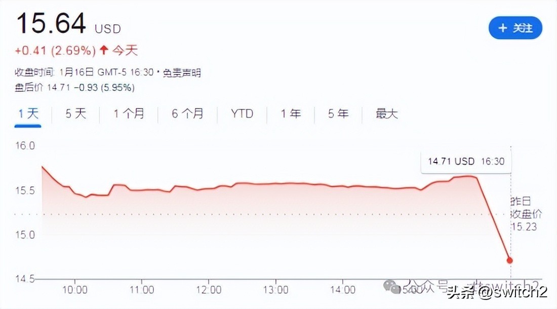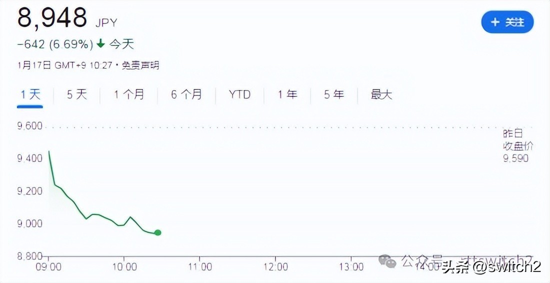 不知道是不是受这些文章的影响,在任天堂正式公布switch2的首个预告之后,股市迅速做出了反应。任天堂日股开盘后一路走低,降幅已接近7%。美股昨日收盘后也延续了下跌的势头,盘后价跌幅接近6%。
